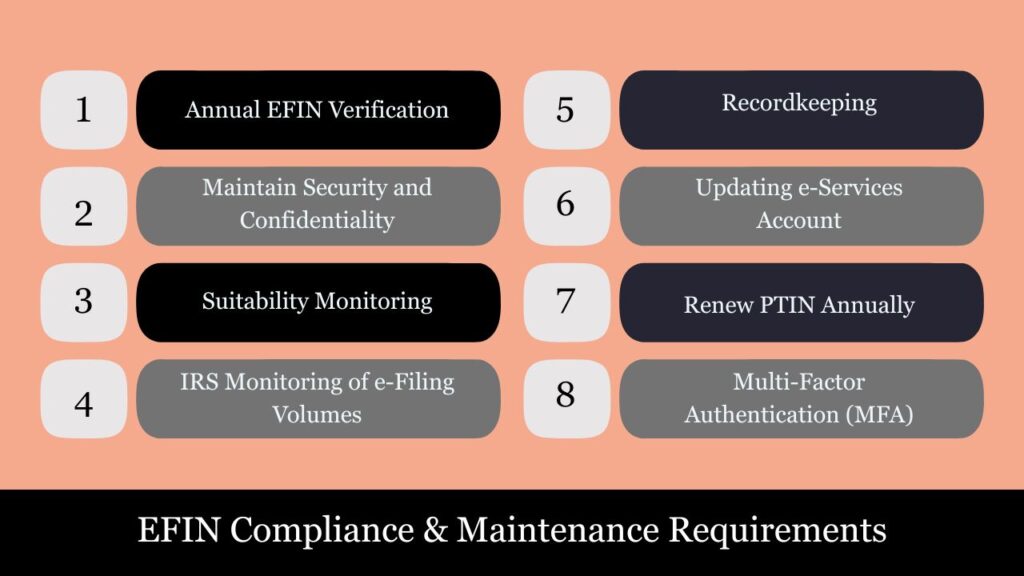- To maintain compliance, each EFIN undergoes periodic IRS checks for authorized use.